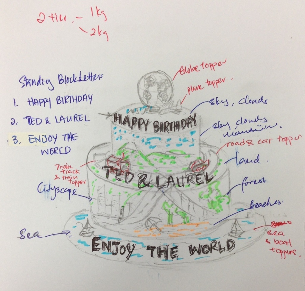 随性妈妈不会做美美的生日蛋糕,只好自己设计然后再找个蛋糕师傅做。这就是她老人家的设计。 蛋糕的主题是享受这美丽的世界,因为两老希望我们能环游世界,享受人生!